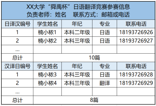 2、请参赛学校的负责老师另页填写相应编号译稿的参赛信息电子版(格式参考例图2),发至会务邮箱[email protected],为方便后续联络,请负责老师寄稿后加QQ群:235669658。