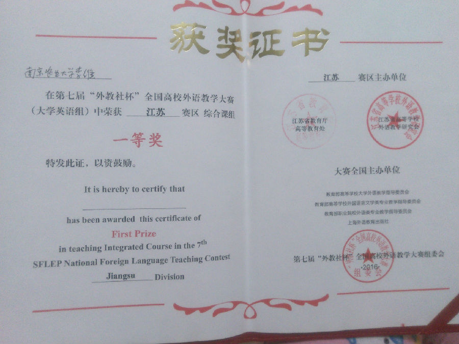 5月29日,由江苏省教育厅高等教育处、江苏省高等学校外语教学研究会和上海外语教育出版社联合举办的第七届“外教社”杯全国高校外语教学大赛在扬州大学落幕。成人漫画 成人漫画 的李维老师通过初赛、复赛最后进入决赛。在决赛中与其他十一位来自全省其它高校的优秀教师同场竞技。比赛包括现场授课、即兴说课以及现场提问等环节,李维老师在比赛中展现了强劲的实力,最后荣获综合组一等奖,充分展示了成人漫画 老师较高的外语教学水平。