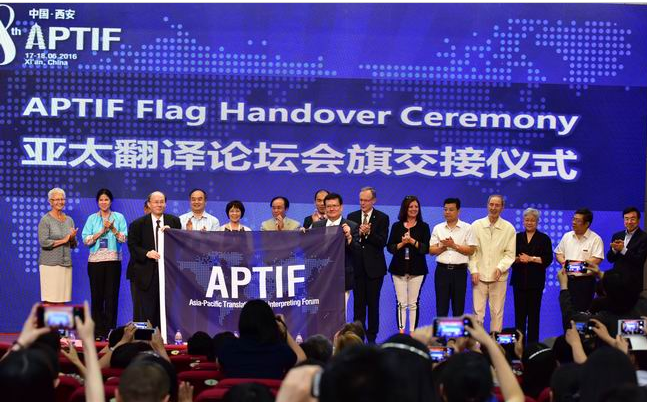 在闭幕式上,第八届亚太翻译论坛承办单位代表、西安外国语大学校长王军哲向第九届亚太翻译论坛承办方代表、韩国口笔译协会会长、韩国外国语大学教授郭重哲交接了论坛会旗。第九届亚太翻译论坛将于2019年在韩国首尔举行。