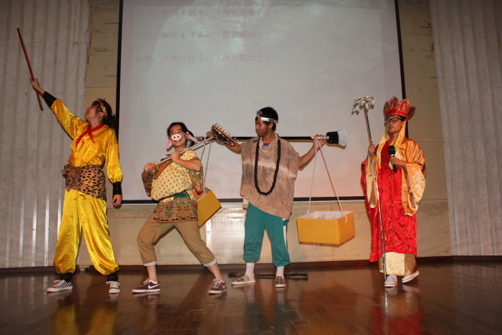 外文戏剧节以纯正美音与英音碰撞为特色的剧目《公主日记》拉开了序幕。之后正剧《莎翁情史》以莎士比亚的爱情故事带给观众无限感动。而第三组《灰姑娘》剧本将经典故事进行创意加工,演员表演张弛有度,掀起全场第一个小高潮,报告厅内频频响起热烈的掌声。接下来的经典童话《海的女儿》,日语专业大一同学表演的《甄嬛传》,堪比《盗梦空间的》烧脑神剧《圣诞颂歌》,道具精美的《绿野仙踪》也都被演绎的惟妙惟肖。之后上场的《西游记之三打白骨精》剧组一开始就紧抓眼球——以日语演绎我国传统名著。其间阴险毒辣的白骨精、勇敢机智的孙悟空、贪吃可爱的猪八戒、憨厚老实的沙僧以及慈悲为怀的唐僧都演的入木三分。《窈窕淑女》生动形象地展现了卖花女伊莱莎的勇敢与骄傲。最后登场的原创版《爱情公寓》大胆创新,以电视剧版的《爱情公寓》角色为基础,情节上从“余小贤”彩票中奖百万到彩票不翼而飞,失去爱到找回爱,大起大落,扣人心弦。最后一段关于金钱与爱的思考更是让观众在爆笑不止的同时深思现实,将现场气氛推上最后的高潮。