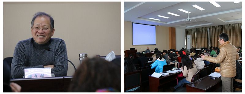 在主题报告之后,顾飞荣教授、三名青年教师及两名研究生就学术研究方法向潘教授提问,潘教授回答了师生在学习和研究中困惑的问题,如怎么提高科研的实用性,潘教授认为科研最终还是为教学服务,不能为科研而科研。他还阐述了科研与艺术的关系,强调要提高艺术修养,从而提高科研能力。最后,侯广旭教授从抽象哲理思维和逆向思维两方面简要地赞评了潘教授的报告。全体师生以热烈的掌声对潘教授的精彩报告表示感谢。