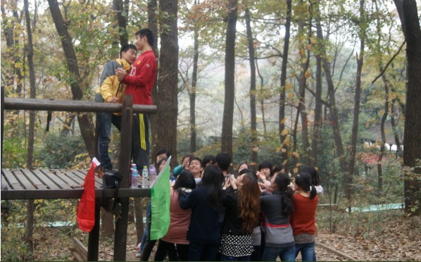 当日上午7时许,学生干部们在大学生活动中心集合,精神抖擞地向中山陵素质拓展基地进发。由于大部分同学都是首次参与此类训练,教练员安排了偏向思维活动和考验团队协作能力的训练计划。首先第一课就是“破冰建设”。通过几个简单的小游戏,同学们建立了团队,消除了紧张感,以轻松愉快的心情投入到接下来的训练中。紧接着的项目就是“信任背摔”。从1.5米高的高台直挺挺倒下,并落在高台下同伴们用手臂搭建起的支架上似乎是一件难以完成的任务。特别是女同学们,站在高台边缘时,仍是难以鼓足勇气往后倒。高台下的同伴们高喊着“时刻准备着”、“来吧,亲爱的”鼓励她们。当稳稳当当地跌入高台下同伴们的臂弯中,一颗悬着心终于安定下来,当挨个与同伴击掌表示感谢时,心里又油然生出一种感动,身在这集体中真好。