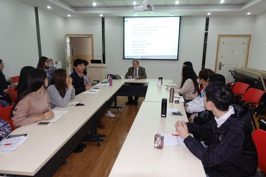 师生做了题为“当代非裔美国文学批评”(Contemporary African American Criticism)的精彩讲座。参加此次讲座的有学院部分中青年教师和研究生,讲座由段道余博士主持。