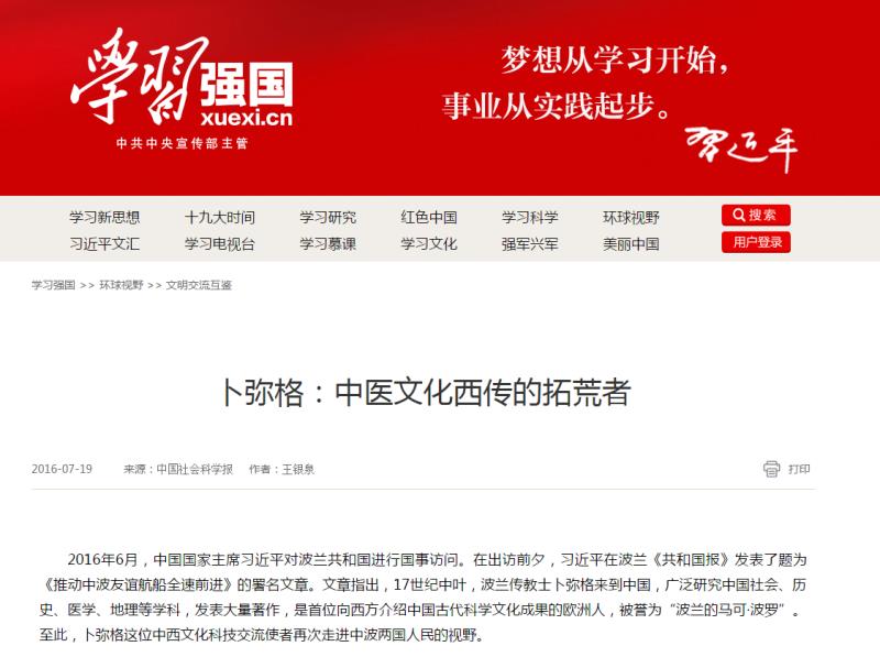 王银泉教授曾发表在《中国社会科学报》的文章《卜弥格:中医西传的拓荒者》最近入选由中宣部打造的全国党员在线学习平台“学习强国”。“学习强国”学习平台是立足全党、面向全社会的科学理论学习阵地和思想文化聚合平台,今年1月1日在京举行了上线仪式,中共中央政治局常委、中央书记处书记王沪宁出席仪式并宣布平台正式上线。