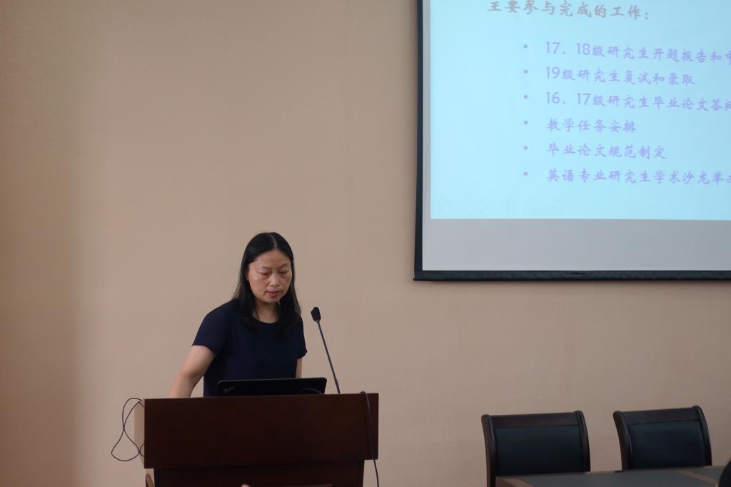本次会议分两个阶段进行。会议第一阶段由学院学术委员会主任王银泉教授主持。英语和日语两个二级学科点负责人裴正薇教授和李红教授分别就两个学科的建设发展作了汇报交流。李红教授就成人漫画