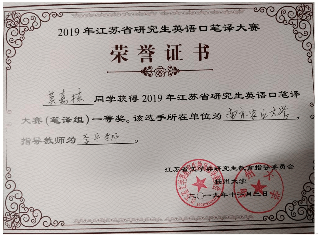争得了荣誉。尤其是莫嘉栋同学,在笔译赛事中以总成绩第一名获得一等奖(总成绩=汉译英成绩*50% +英译汉成绩*50%)。