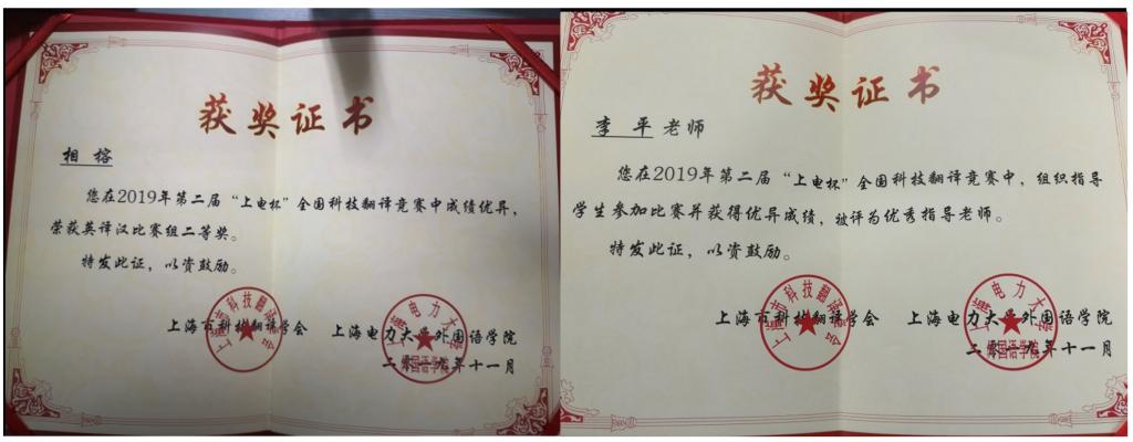 英语系本科三年级学生相榕获得英译汉组二等奖,MTI研究生周游获得三等奖。11月23日,相榕同学应邀出席了在上海电力大学举行的颁奖典礼。