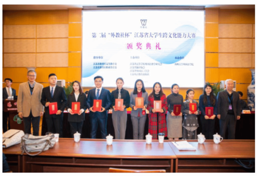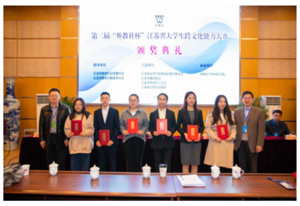 11 月 20 日,第二届“外教社杯”江苏省大学生跨文化能力大赛在扬州大学成功举行,本次江苏赛区的大赛由江苏省教育厅高等教育处、江苏省教育厅职业教育处指导,江苏省高等学校外国语教学研究会、江苏省翻译协会、江苏省外国语言学会、上海外语教育出版社主办,来自江苏省内院校在读中外参赛学生、指导教师、评委专家共约 150 人参加了大赛。