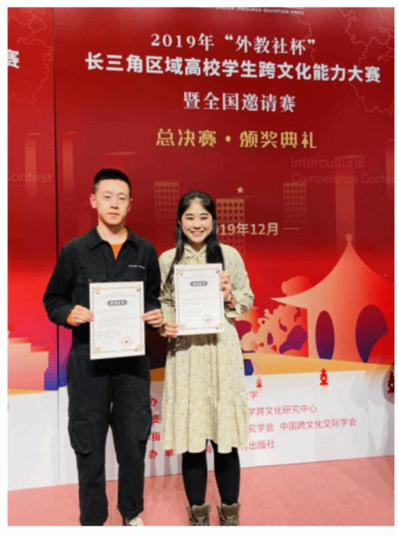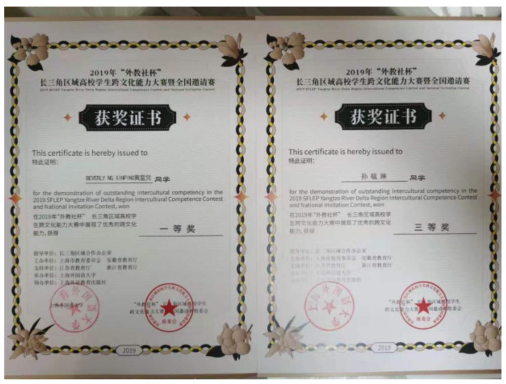 学生黄星凭(BEVERLY NG XINPING)和孙毓琳入选江苏省代表队。通过两天激烈的角逐,两名选手在跨文化案例展示和现场问答环节表现优秀进入总决赛。总决赛分为三个环节,跨文化知识快问快答、情景评述、讲述中国故事,留学生黄星凭(BEVERLY NG XINPING)获得总决赛一等奖和特别贡献奖,孙毓琳同学获得三等奖,两位同学赢得了专家评委们的一致认可;外语学院苏瑜、王婷和徐红芳三位老师获得优秀指导奖。