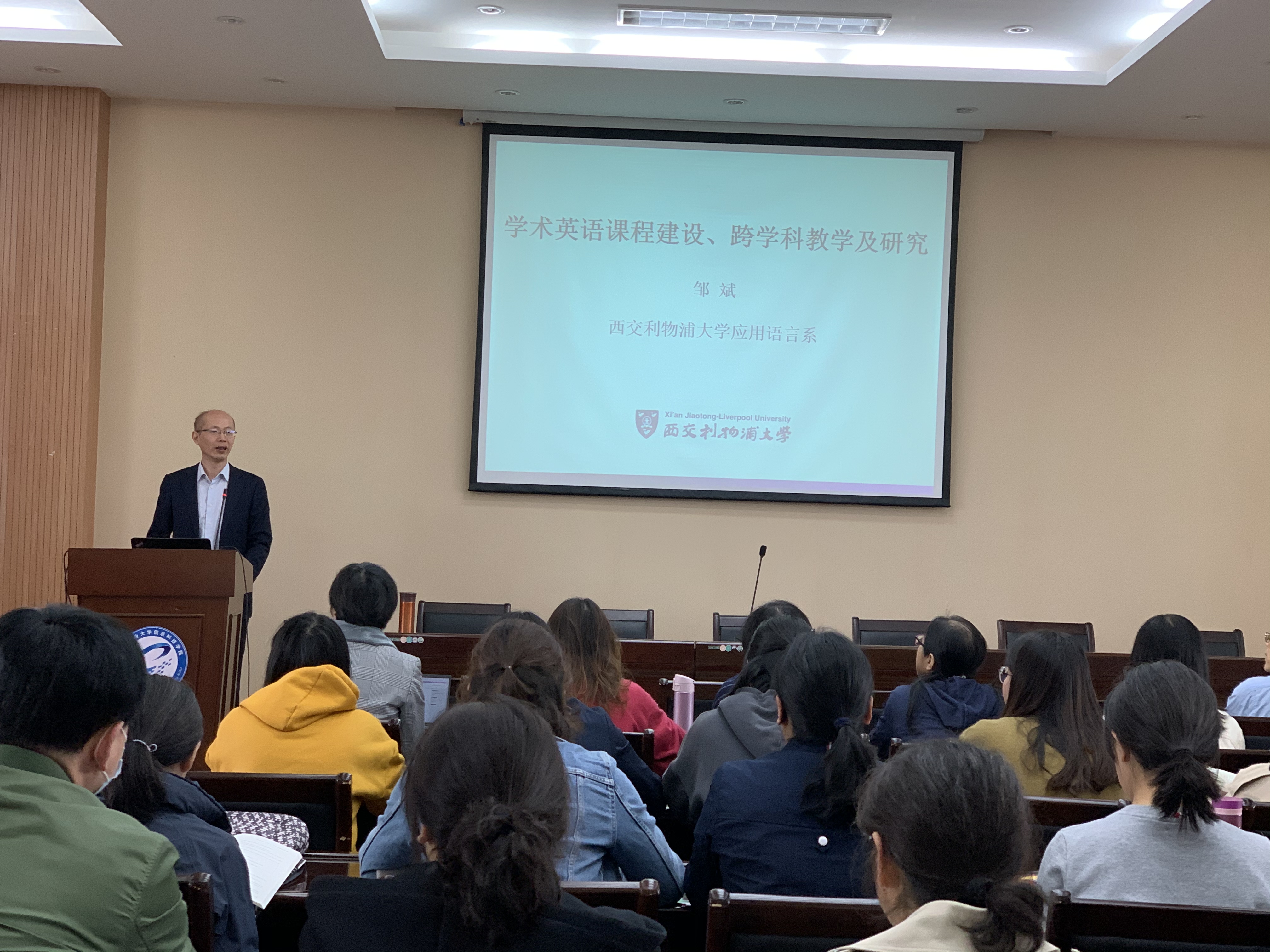 报告分为三个部分。首先,邹斌副教授介绍了自己的研究兴趣所在,主要研究方向为学术英语教学、外语教育技术、人工智能及语料库。并简要介绍了自己正在研究的项目:学术英语口语人工智能自动评分系统研究。随后,邹斌副教授分享了自己对于学术英语课程体系建设的研究,他详细阐述了该体系建设发展的历史和现状,结合自己多年的亲身教学经历和研究,认为学术英语不仅能培养学生的专业学习和研究能力,更能培养学生的综合能力以及工作中的实际能力。随后他向我们介绍了西交利物浦大学的学术英语课程设计,尤其是商务英语教学设计,让我们对此有了更直观的了解。最后,邹斌副教授介绍了学术英语跨学科教学在西交利物浦大学的具体应用,也就是专业老师主导,英语老师为辅的共同教学模式,这种模式引起了在场老师的极大兴趣,不少老师称从这种教学模式中受到了很大启发。