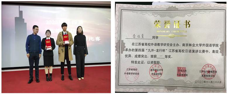 李佳萱同学日语水平扎实、发音优美,演讲内容紧扣主题,故事性强。定题演讲环节沉着泠静,顺利进入决赛。即兴演讲环节可准备的时间非常短,不仅考察学生的日语水平,更需要很好的临场反应能力和心理素质。经过的激烈比拼,李佳萱最终凭借出色的发挥在本次大赛中获得一等奖(指导老师为周萌、藤波喜代美)。