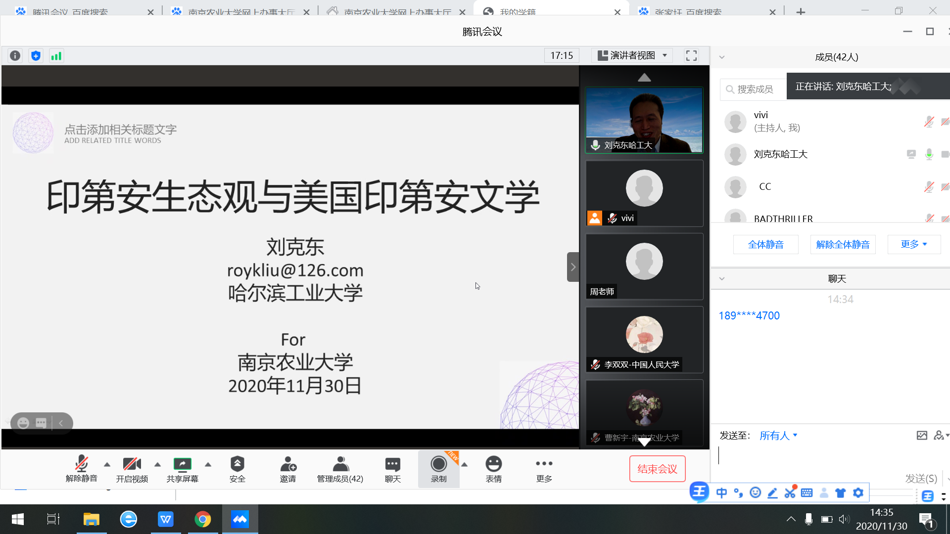 师生做线上讲座表示热烈地欢迎和诚挚地感谢,并介绍了刘克东在英语文学研究方面取得的丰硕的学术成就和深厚的学术积淀。她表示“生态文明”是近几年的热点话题,在党的十七大、十八大、十九大报告中均有专门论及。