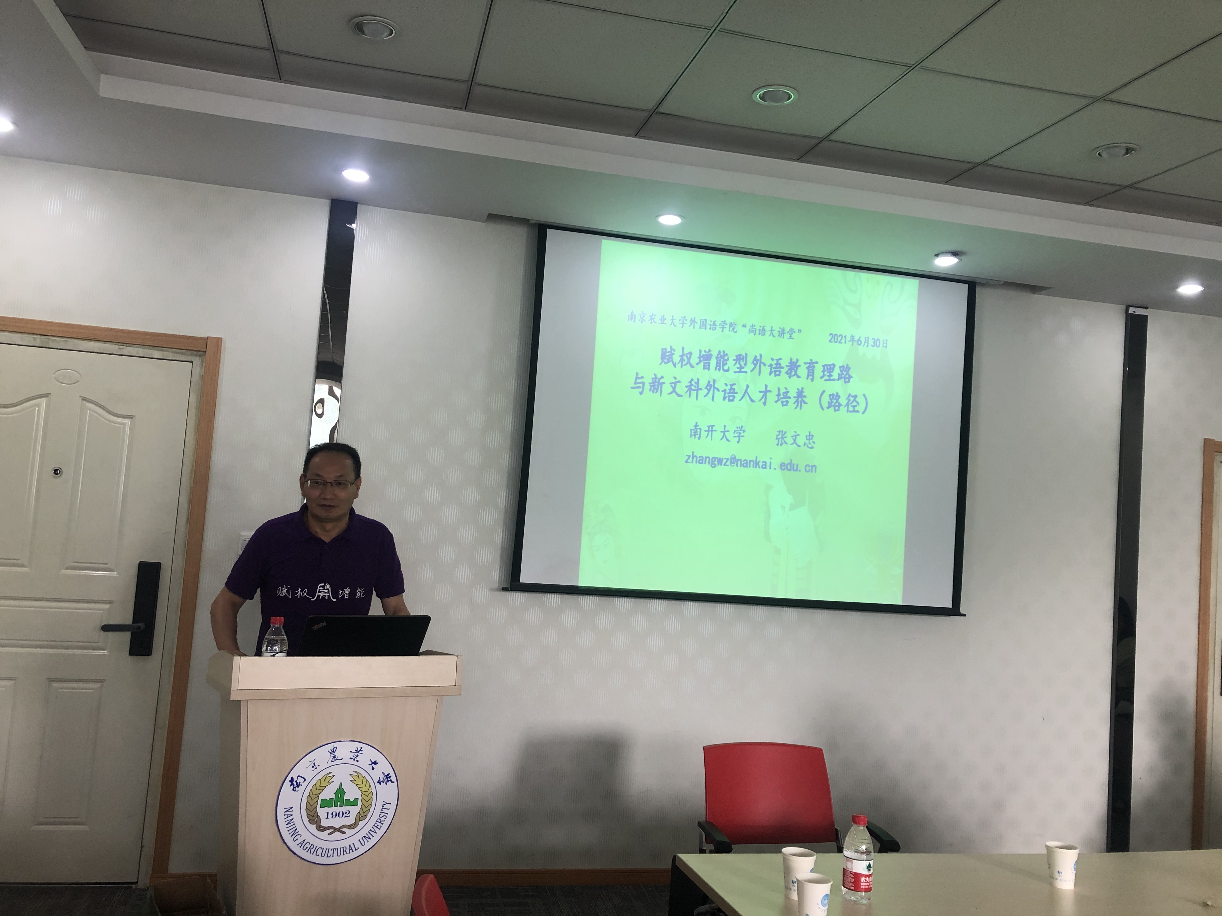 张文忠教授的讲座从以下三个方面展开:(1)赋权增能型外语教育理路;(2)对若干根本问题的理解;(3)新文科外语人才培养的可选路径。他从我国英语学习长期以来存在的费时低效现象说起,谈到了我国英语教学为代表的外语教学普遍存在的学用分离的现象,以至于学生的外语应用能力普遍低下,无法完成最基本的交际能力,更谈不上服务国家战略与社会需求。在此基础上,张文忠导出他十几年前就开始探索和创新的“个性化英语学习”和“英语研究式学习”课程实践,即赋权增能教学法,其核心理念是学习本是学生的权利,但长期以来教师包办太多,以至于以碎片化知识点传授和语言技能操练的灌输式教学法始终未能得到根本性改变,教师没有教会学生掌握学习方法,提升学习能力,学生不但不具备发现问题、分析问题和解决问题的能力,而且无法成为终生学习者,一旦走上职场,很难适应社会需求,更难以通过自我构建新的知识体系,来适应社会的快速变化与发展。