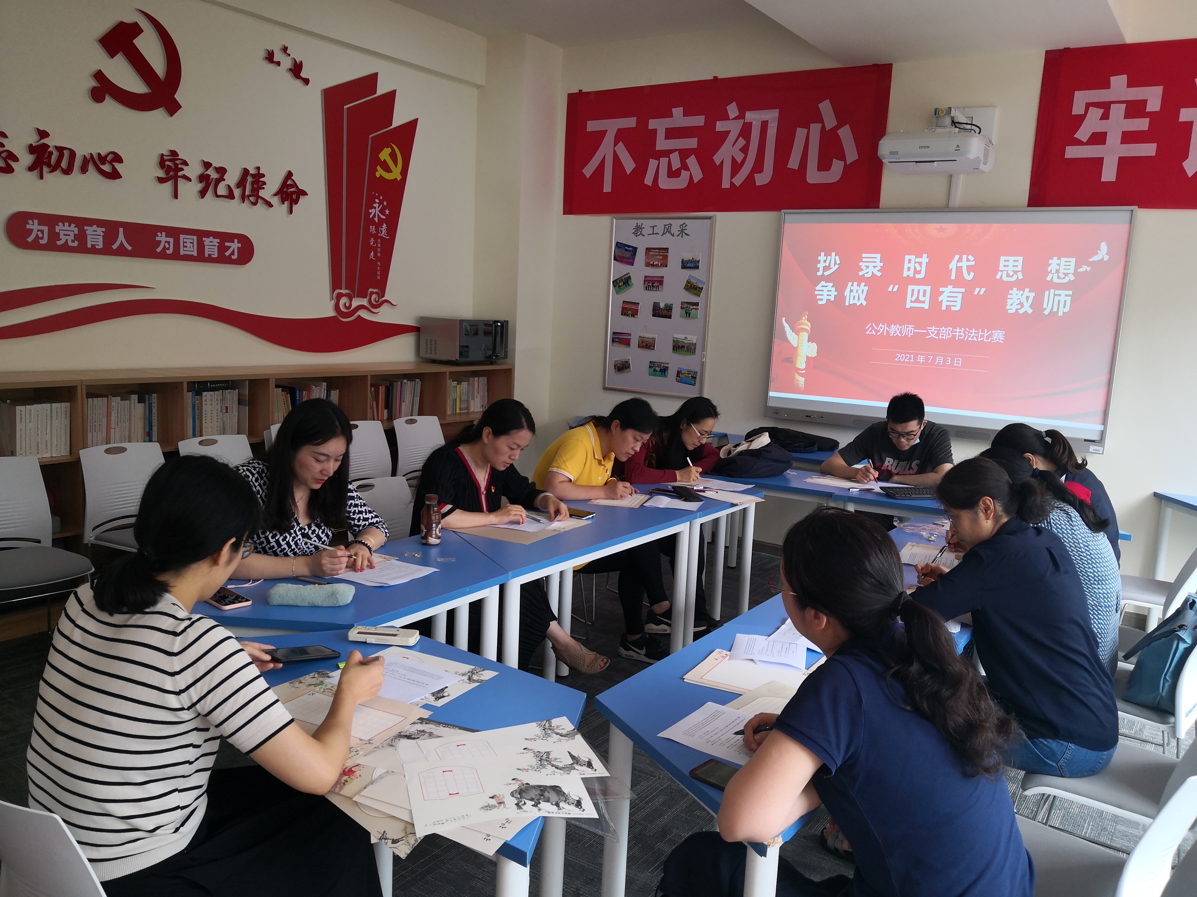 公外教师一支部举行了题为“抄录时代思想,争做‘四有’教师”的书法主题党日活动,全体党员通过抄录习近平总书记重要讲话中的中英金句,切磋书法技艺,领悟伟大精神,凝聚磅礴力量,助力一流建设。