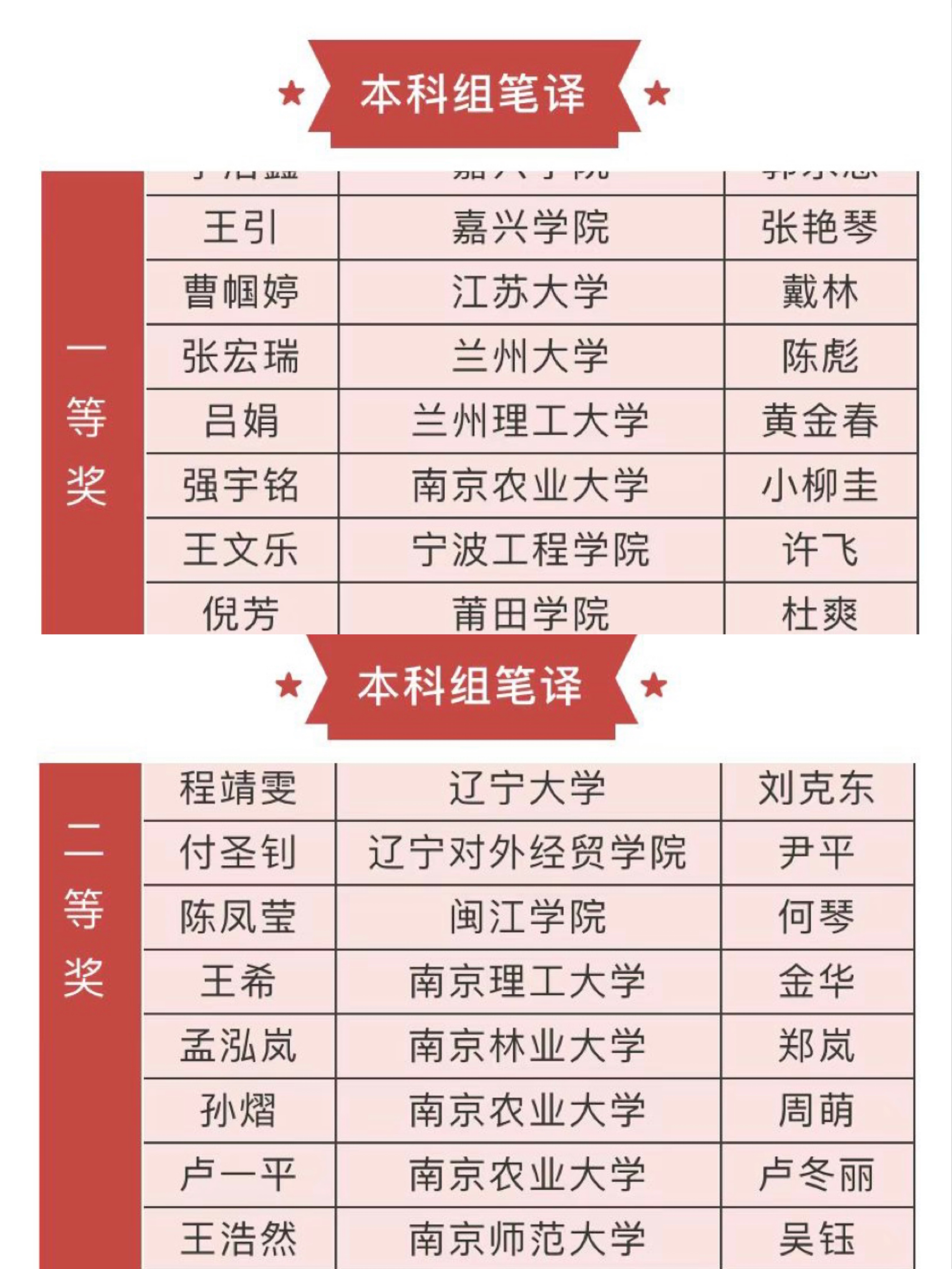 学子斩获佳绩。本科组汉译日,强宇铭(小柳圭指导)获一等奖,卢一平(卢冬丽指导)、孙熠(周萌指导)获二等奖,颜静莹(周萌指导)、刘芮宏获三等奖。本科组日译汉,金鑫(万枫指导)获二等奖;罗文浠(刘青指导)、林可欣(卢冬丽指导)、柳玉琪(卢冬丽指导)、强宇铭(卢冬丽指导)、孙熠(周萌指导)、刘芮宏获三等奖。夏心怡、曹悦然、夏玥莹等9位同学获得优秀参与奖。同时,南京农业大学获优秀组织奖。