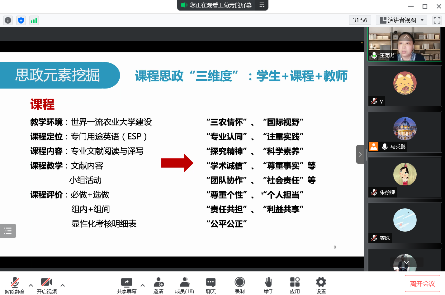 会上,第二批“课程思政”示范课程建设项目的负责人和第三批“课程思政”示范课程建设项目(耕读教育专项)的负责人依次进行汇报,各位老师结合教育部《高等学校课程思政建设指导纲要》、《江苏省课程思政示范课程建设指标》和《南京农业大学课程思政建设实施方案》等文件要求,通过展示凸显课程思政理念的教学大纲,体现课程思政特点的新教案、新课件,以及蕴含课程思政育人典型教学的案例,从课程思政建设实施方案、项目完成情况、课程思政建设成效及教学反思等方面对项目情况进行了汇报。其中,英语系钱叶萍老师和公外部朱徐柳老师,结合自己负责的课程,讲述了外语教学中课程思政教学设计要点,针对如何挖掘思政元素、如何与外语课堂教学深度融合展开深入分析,被推荐参加校级优秀项目的评选。