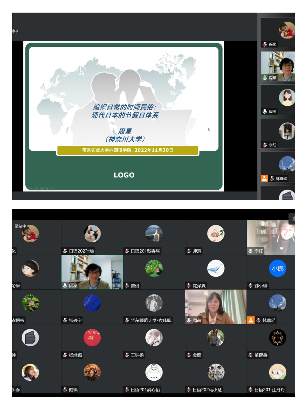 周星向我们介绍了日本的自然节律与文化节律,即,农耕礼仪上日本的稻作周期和稻作仪式以及中国24节气影响下日本的农事时间点;进而谈及日本的主要年中行事(岁时节庆),介绍了日本学术界存在的“年中行事的二重结构”理论;之后,再系统梳理了日本国家制造的节假日体系,指出现在日本节假日中的国民化和法制化趋势在不断增加,但仍保有天皇色彩;通过对上述主题的梳理,周星教授最后引出对时间的民俗和时间的民俗学的解释,以及非常(ハレ)·日常(ケ)·反常(ケがレ)论的学术探讨,做出了生动有趣的深度解读,展示了独特的研究视角和理论成果。问答环节,周星对师生的在线提问进行了详细解答。