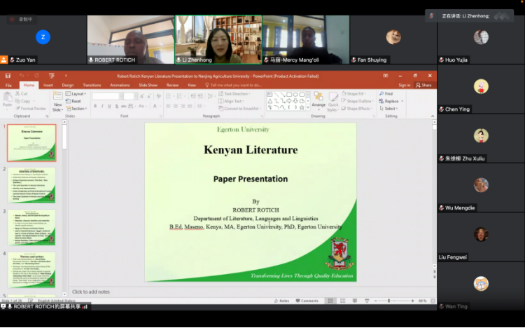 Robert Rotich在报告中介绍了肯尼亚从殖民时期至今的文学简史,着重阐述了小说这一重要样式如何定义肯尼亚的身份与文化,介绍了形成肯尼亚独特写作形式和内容的肯尼亚代表性作家及其在作品中反映的具有东非区域特征的肯尼亚的历史、文化和本土现实。Mercy Mang’oli从具体实例出发,评估肯尼亚本土语言在文学创作中的应用程度,说明理解本土语言对于理解特定社会的政治、宗教、经济和文化等方面的积极作用。报告结束后,两位老师就大家提出的问题做了详细解答。