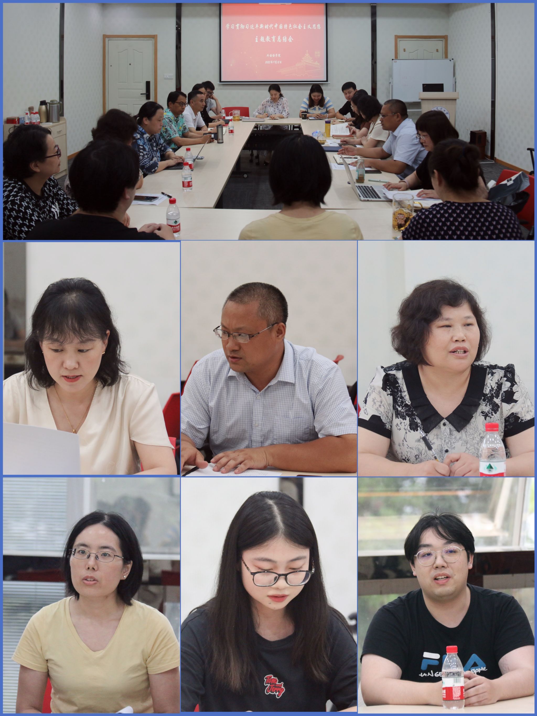 董红梅首先代表学院做学习贯彻习近平新时代中国特色社会主义思想主题教育总结。自主题教育开展以来,学院党委深入学习习近平总书记在主题教育工作会议上的重要讲话精神,牢牢把握“学思想、强党性、重实践、建新功”的总要求,紧紧锚定目标任务,认真组织开展主题教育,紧密结合学院工作实际,精心谋划、周密部署,一体推进理论学习、调查研究、检视整改和打造外语特色党建品牌。