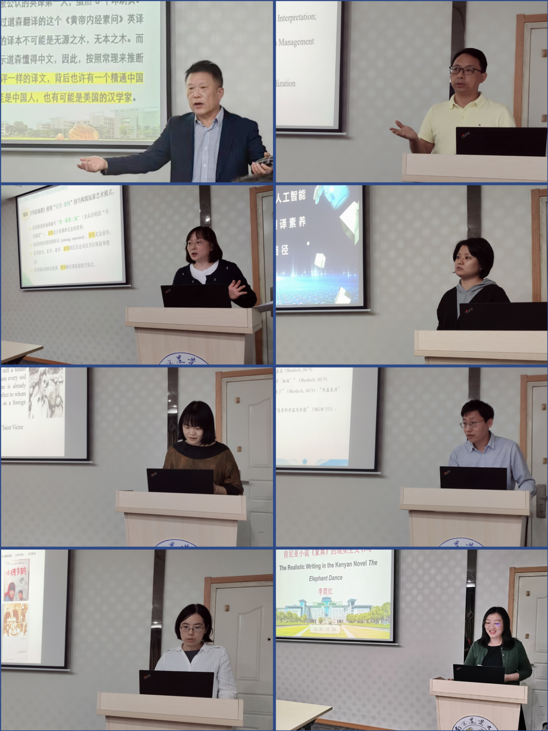 本年度共有9位教师进行汇报,汇报内容涉及外国文学、翻译、外语教学与电影等研究领域。在翻译与外语教学方面,王银泉首先作了题为《法国汉学家、加拿大裔美国生理学家与<黄帝内经>首部英译本》的汇报,考证了《黄帝内经》译者为加拿大裔美国人及其依据法语译本翻译《黄帝内经》的过程。李平则结合他在美国的访学经历及其对翻译教学的思考,作了题为《基于国际市场的翻译教学理念与课程设计》的汇报,分析了美国的翻译课程设置、翻译人才的培养与语言服务情况。李红作了题为《文明互鉴:汉译<几何原本>东传日本及其公理化知识受容研究》,探讨了《几何原本》在日本的译介。杨艳霞作了题为《人工智能时代的机器翻译素养》的汇报,分析了人工智能的发展历程以及人工智能时代译者所需的各类素养。