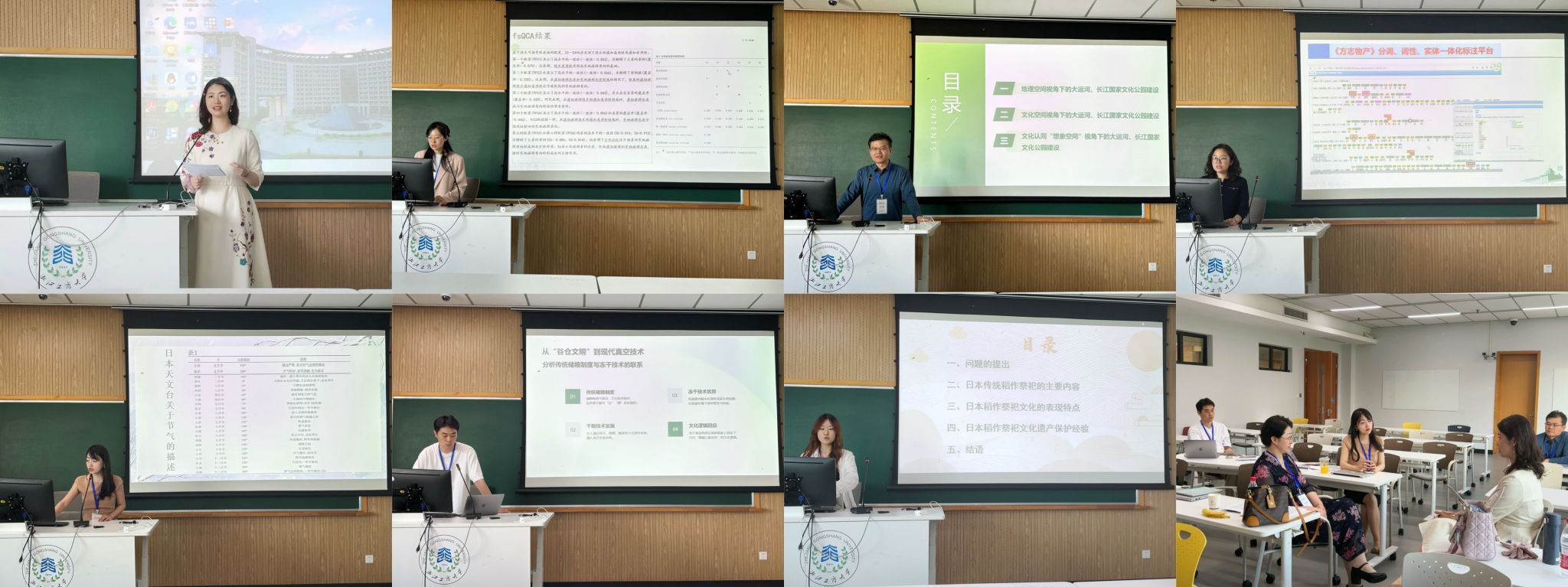 路璐教授、李明教授、朱锁铃教授,李红教授、陈海涛博士、袁帅博士受邀参会。在学术研讨环节,各位专家学者各展所长:路璐与博士生梁晶璇以“文化基地与技术可接受性:虚拟技术如何推动大运河实地旅游”为题发表演讲,探讨科技赋能文旅的创新路径;李明聚焦“多维空间视角下大运河、长江国家文化公园建设的比较研究”,深入剖析文化遗产保护与开发的新方向;朱锁铃通过“基于方志古籍的中国江苏地区传统水稻品种的时空分布研究”,挖掘农业历史文化的深厚内涵。此外,李红与研究生郑哲共同探讨“日本稻作祭祀文化的内涵及其遗产保护经验”;陈海涛以“中华农耕文明跨域传播及在地化演变——以二十四节气为例”为切入点,阐述文明传播的独特规律;袁帅则围绕“食物保存技术现代化中的传统再生:以中日冻干食品为中心的文化考察”,展现传统与现代的交融。分组汇报结束后,与会学者就数字人文研究、区域国别学智库建设、复合型人才培养等前沿议题,开展多维度、跨学科的深度研讨,碰撞出思想火花。