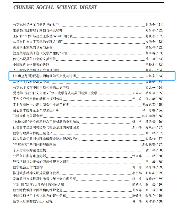 王银泉教授为唯一作者身份完成的中西文化科技交流史研究的论文“康熙大地测绘与《皇舆全览图》西传考”(发表于《贵州社会科学》2024年第12期)被《中国社会科学文摘》(2025年第5期)以论点摘要方式转载。