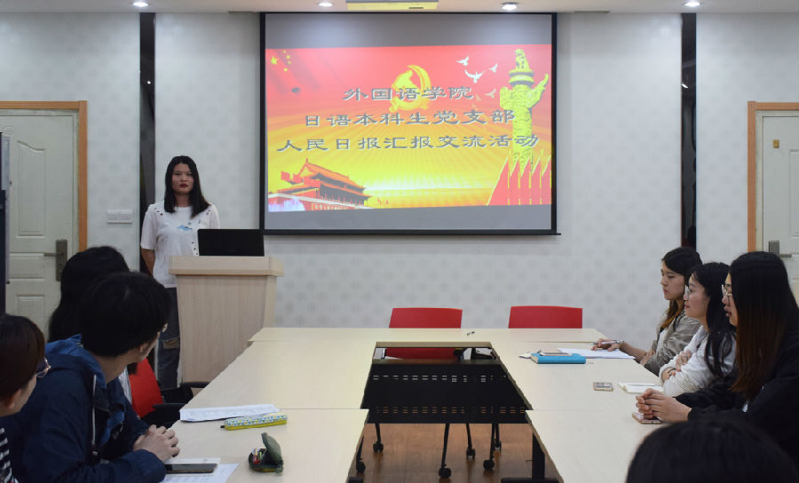 日语本科生党支部《人民日报》学习汇报交流活动在教学楼A310举行。支部书记贾琼及支部全体党员参加,活动由贾琼主持。