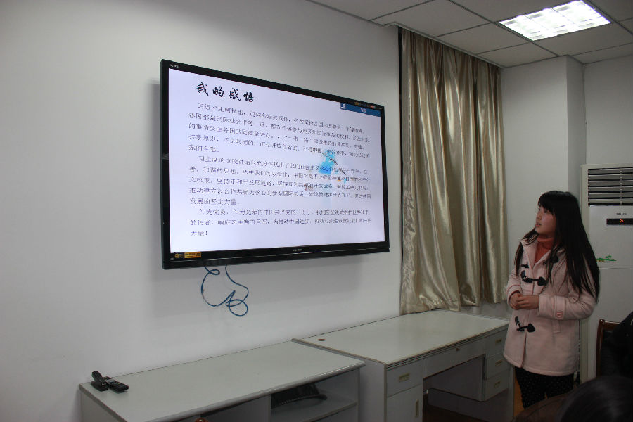 活动伊始,卓婷婷老师强调了学生党员学习《人民日报》的重要意义。随后,各学生党员以PPT形式汇报了《人民日报》的学习心得。日语本科生党支部副书记、老党员孙宇同志就反腐风暴为主题表达身为党员更要刚正不阿的决心;预备党员薛明亮、郭春晓、周真艳则将眼光投向文化教育与生态保护,关注文物保护,废旧电池回收再利用,传统阅读与数字阅读等一系列热点新闻,号召大家从身边小事做起,保护秀丽山河,传承民族文化。接着,英语本科生党支部预备党员施芸、赵润曦通过汇报,向大家介绍了供销合作社改革,博鳌亚洲论坛,中国足球改革等多则时事新闻,生动有趣。汇报期间,卓婷婷老师就每位同学的汇报都加以点评或稍作提问,同学们都认真学习,受益匪浅。